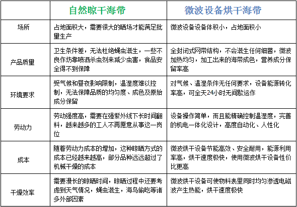 海帶的烘干方式很多,傳統(tǒng)的烘干方式往往采用自然晾曬烘干,而新式的微波烘干越來(lái)越受到海產(chǎn)品加工業(yè)的追捧,下面我們從多方面切入,對(duì)比一下這兩種比較典型的烘干方式: